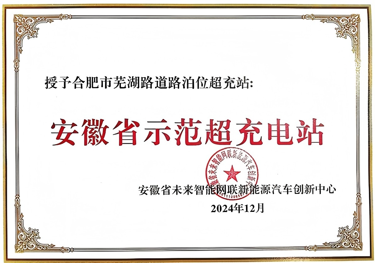 2024年12月6日,皖小能合肥市蕪湖路超充站榮獲省汽車辦授予的“安徽省示范超充站”稱號(hào)。
