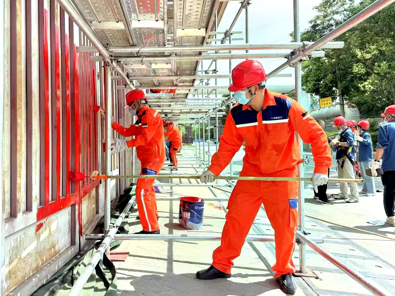 消防車庫與公司2號(hào)門鄰近,車庫整體外觀老舊、斑駁,消防安全辨識(shí)度降低,這不僅影響美觀,也存在一定的安全隱患,針對(duì)這一情況,后勤皖中黨支部書記陳偉帶領(lǐng)黨員志愿者迅速行動(dòng),統(tǒng)籌安排,制定出詳細(xì)的施工方案,從前期腳手架的搭建,到人員分工、現(xiàn)場(chǎng)安全監(jiān)護(hù),每一個(gè)環(huán)節(jié)都做到責(zé)任到人。活動(dòng)中,黨員志愿者們密切配合,嚴(yán)格按照操作規(guī)范,對(duì)原有陳舊、剝落的油漆進(jìn)行徹底清理,認(rèn)真刷漆,每一個(gè)環(huán)節(jié)都一絲不茍,盡管夏季高溫炎熱,但大家熱情高漲,沒有絲毫懈怠。經(jīng)過努力,原本銹跡斑斑的大門煥然一新,消防車庫設(shè)施的可視性和警示性顯著增強(qiáng),整潔明亮的顏色贏得了一致好評(píng)。
