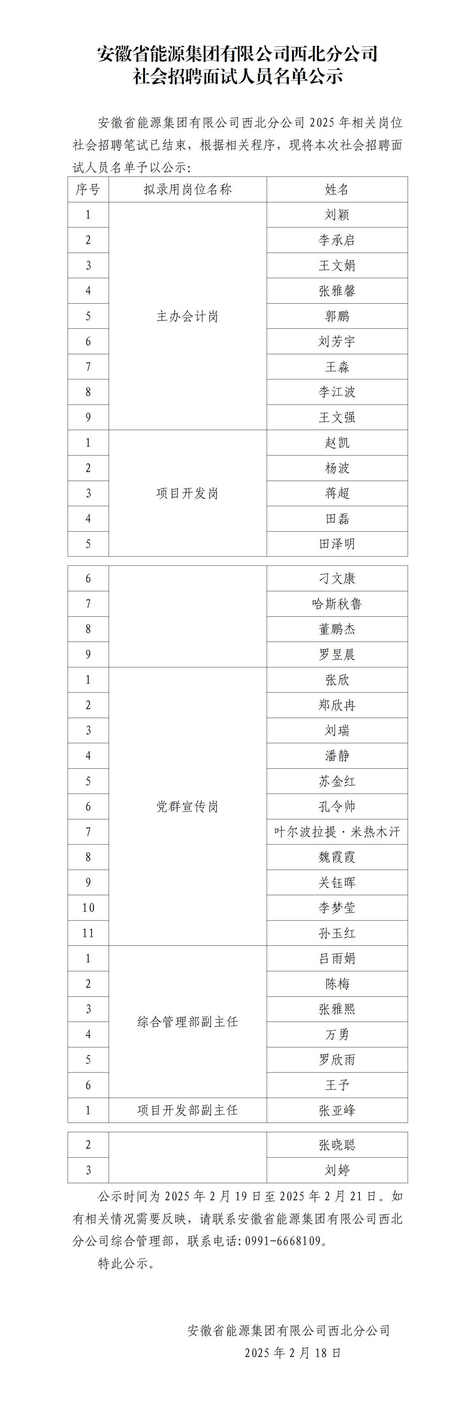 安徽省能源集團(tuán)有限公司西北分公司社會(huì)招聘面試人員名單公示