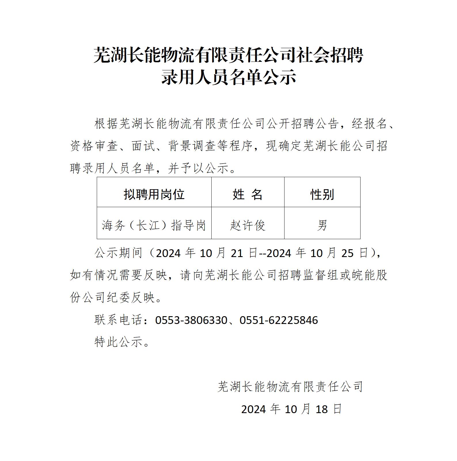 蕪湖長能物流有限責任公司社會招聘錄用人員名單公示