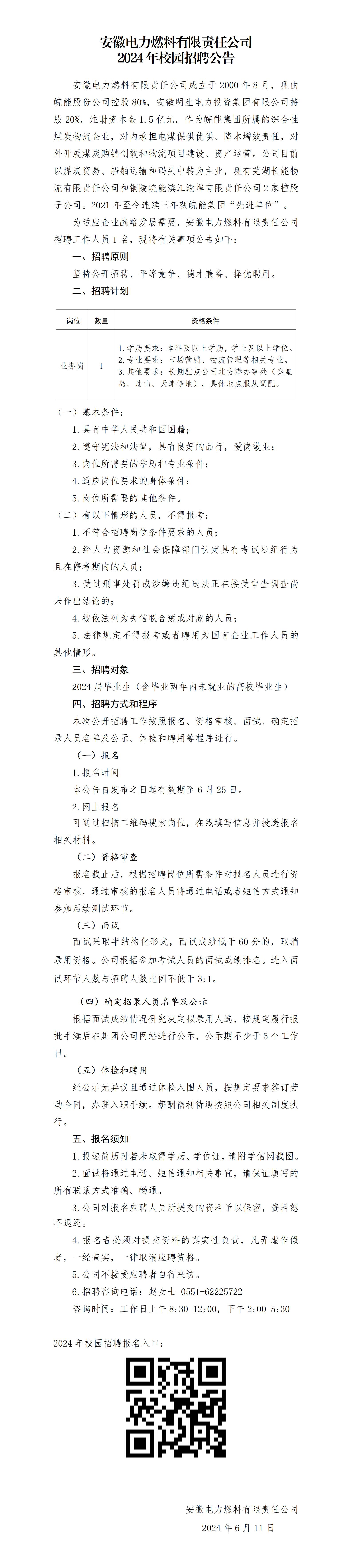 安徽電力燃料有限責任公司2024年校園招聘公告