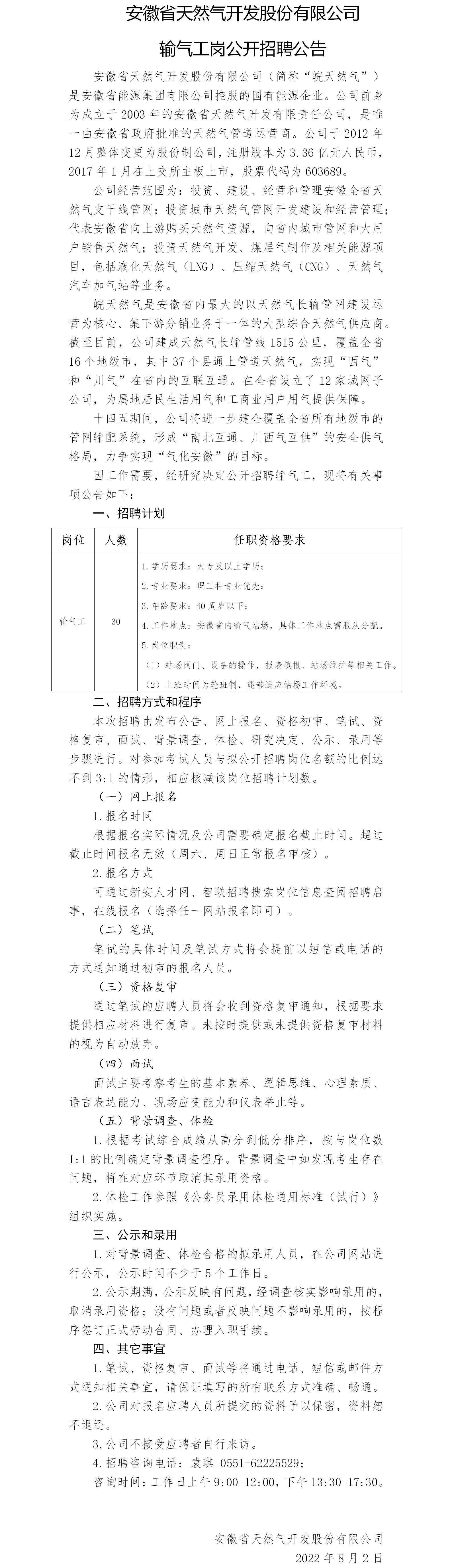 安徽省天然氣開發(fā)股份有限公司輸氣工崗公開招聘公告