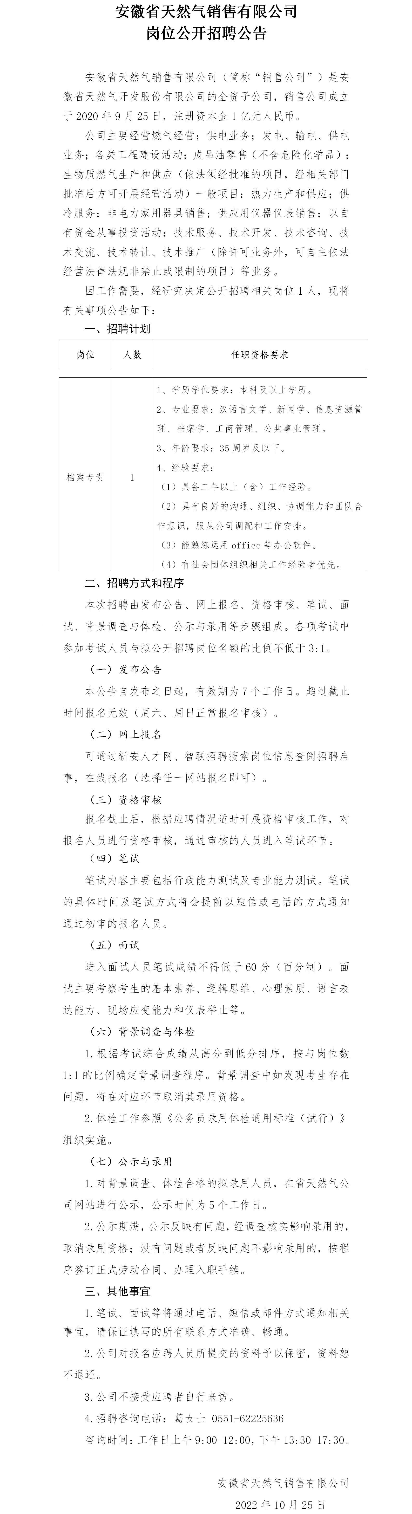 安徽省天然氣銷售有限公司崗位公開招聘公告