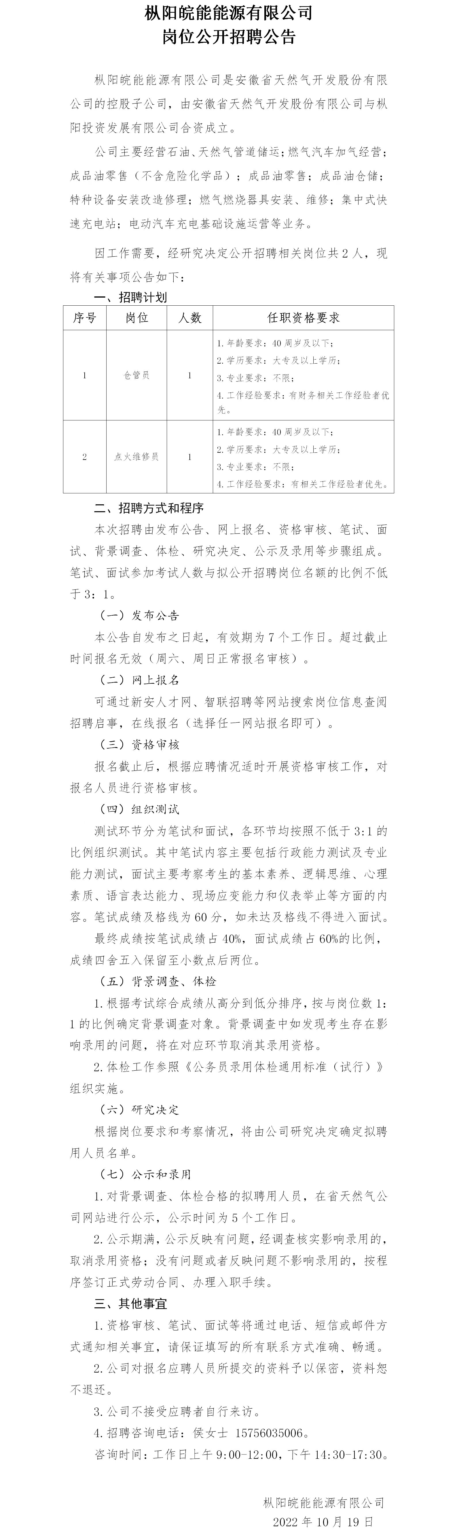 安徽省皖能港華天然氣有限公司崗位公開招聘公告