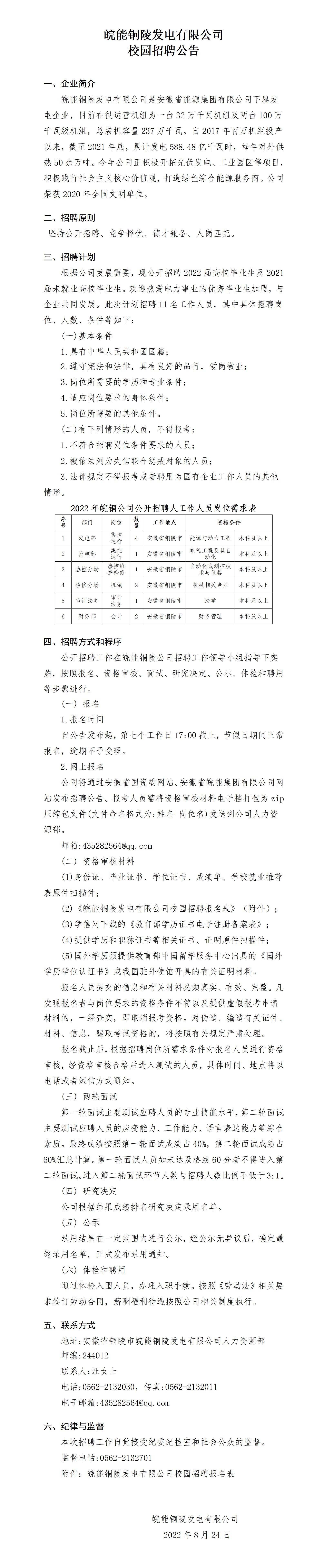 皖能銅陵發(fā)電有限公司校園招聘公告