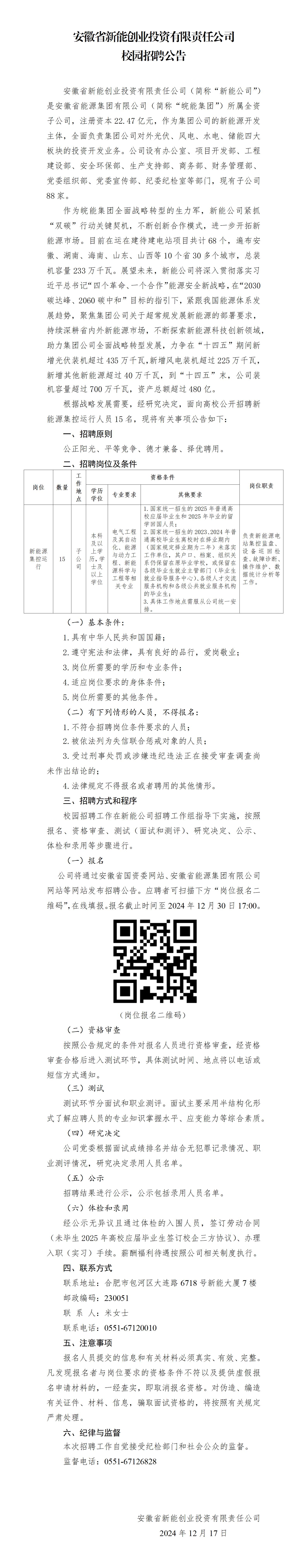 安徽省新能創(chuàng)業(yè)投資有限責(zé)任公司校園招聘公告